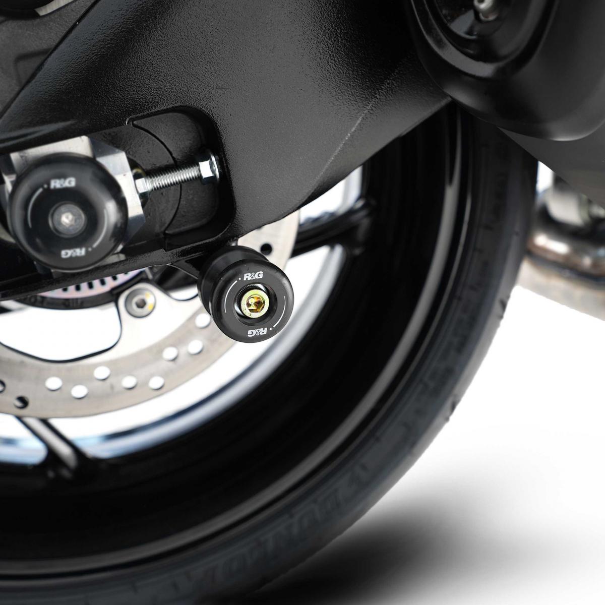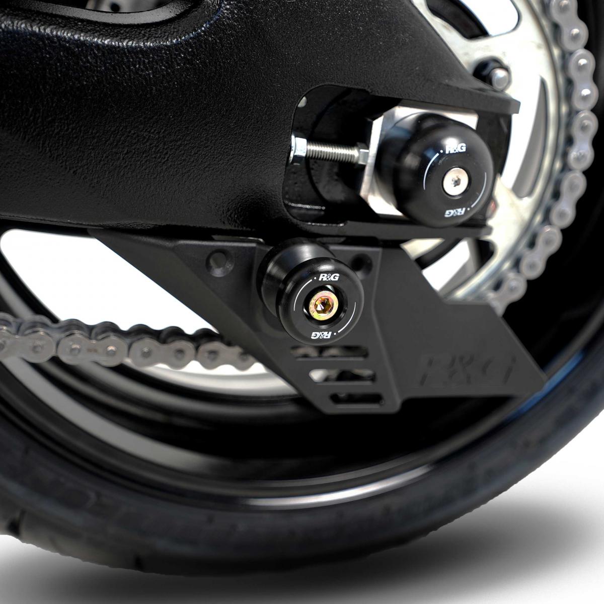 Available in Black, White or Orange finishes. R&G Cotton Reels locate on the paddock stand mounting points on the rear swingarm, offering protection and functionality in one product. Protecting the swingarm and drive components – keeping them off the ground in case of a crash or drop, as well as working as paddock stand points for lifting the rear of the bike onto a paddock stand for tyre removal, chain adjustinglubrication and bike cleaning!